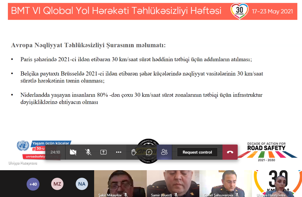 AMAK, Beynəlxalq Avtomobil Federasiyası (FIA) və Təhlükəsiz və Davamlı Nəqliyyat üzrə Şərq Alyansı (EASST) dəstəyi ilə 17 May 2021 tarixində 6-cı BMT Qlobal Yol Hərəkəti Təhlükəsizliyi Həftəsi çərçivəsində Onlayn Dəyirmi Masa tədbiri keçirmişdir. Tədbirdə Baş Dövlət Yol Polisi İdarəsinin Hərəkət Təhlükəsizliyinin Təbliği Və İctimai Qurumlarla Əlaqə Şöbəsinin Xüsusilə Mühüm Tapşırıqlar üzrə baş inspektoru, polis polkovnik-leytenantı Mübariz Ağayev, Təhsil İdarəsinin nümayəndəsi və 45, 243 və 186 nömrəli məktəblərin rəhbərləri, eləcə də valideynlər iştirak etmişdir. Tədbirin məqsədi insanların və nəqliyyatın sıx olduğu yerlərdə, eləcə də məktəb ətraflarında sürət həddinin 30 km/saata endirilməsinin vacibliyini qeyd etmək və bununla bağlı maarfiləndirməni təşkil etmək idi. AMAK tədbiri BMT Qlobal Yol Hərəkəti Təhlükəsizliyi Həftəsinin tarixi, bu ilki mövzusu olan yüksək sürətin yaratdığı təhlükələr və yaşayış ərazilərində, məktəb ətraflarında sürətin 30km/saata endirilməsi ilə qəza risklərinin azalmasına dair məlumatları paylaşaraq açdı. Tədbir iştirakçıları məktəblər ətrafında sürət həddinin azaldılmasının təhlükəsizlik üçün əhəmiyyəti və hazırki yüksək sürət həddi ilə bağlı bugünki vəziyyət və mövcud çətinliklər barəsində müzakirələr etmiş və öz təkliflərini irəli sürmüşdürlər. Polis polkovnik-leytenantı Mübariz Ağayev Azərbaycan Respublikasında Yol Hərəkətinin Təhlükəsizliyinə dair 2019–2023-cü illər üçün Dövlət Proqramında da sürət həddinin aşağı endirilməsi və uşaq travmalarının minimuma salınması üçün tədbirlərin qeyd olunduğunu və sürətin Azərbaycanda baş verən qəzaların böyük hissəsinin səbəbkarı olduğunu vurğulamışdır. Xüsusilə, valideynlər yol hərəkəti təhlükəsizliyi ilə bağlı narahatlıqlarını ifadə edərək, məktəb ətraflarında avtomobillərin sürəti, piyada keçidi zolaqlarının köhnəlməsi, qanunsuz parklanma və bir çox məsələlərə toxunaraq öz fikirlərini bildirdilər. Həmçinin bütün tədbir iştirakçıları yol infrastrukturunda dəyişikliklərin əhəmiyyəti, aşağı sürət həddi və yol hərəkəti təhlükəsizliyi istiqamətində məsuliyyət hissinin dərk edilməsi üçün müxtəlif marifləndirmə kampaniyaları vasitəsilə insanların məlumatlandırılması fikrini dəstəklədilər.