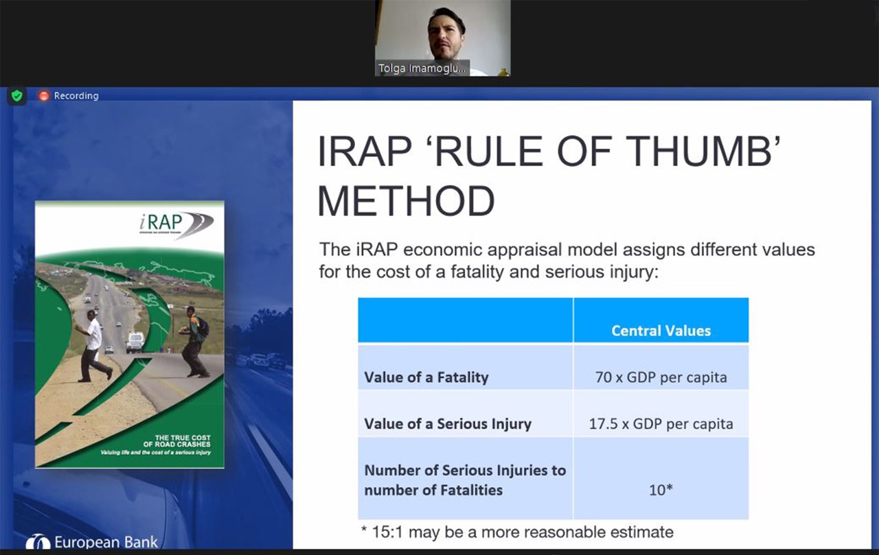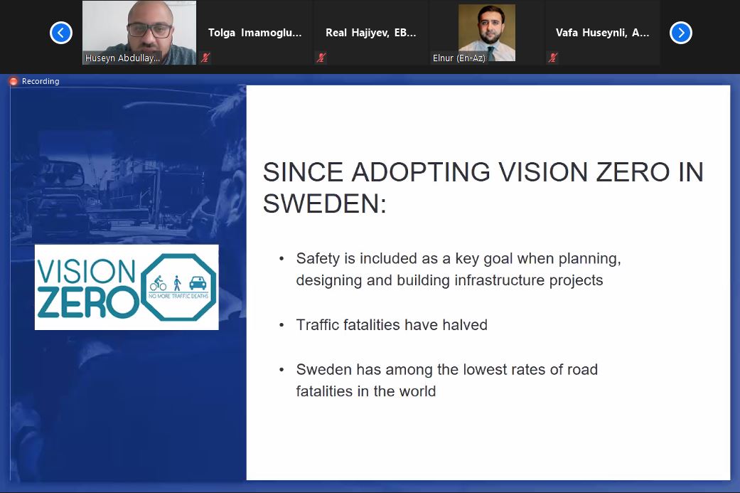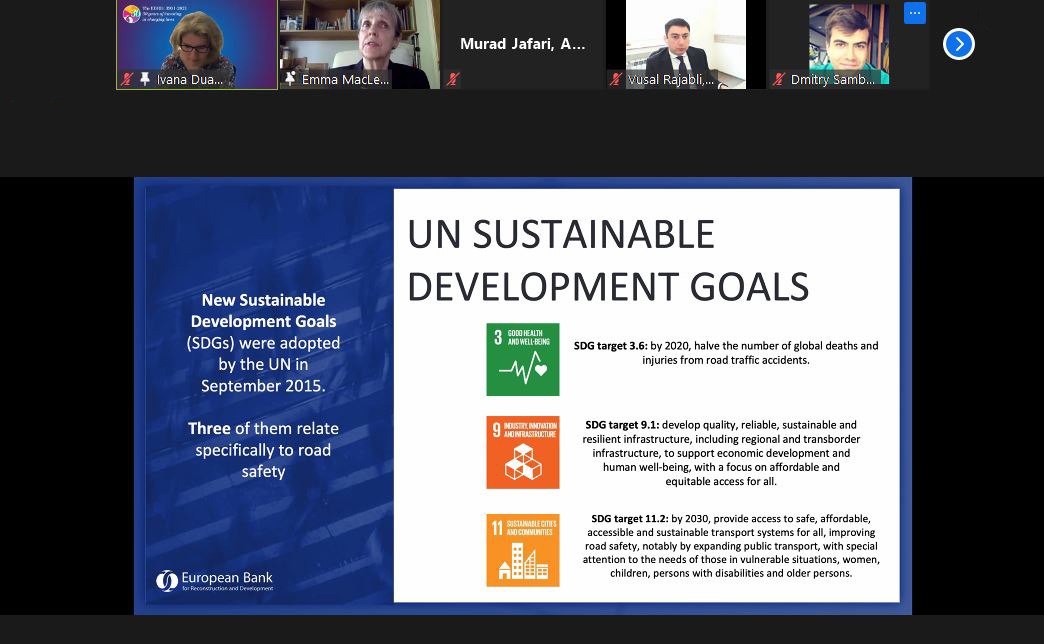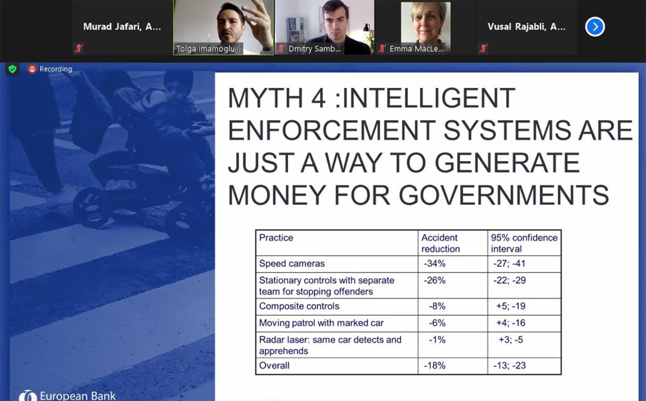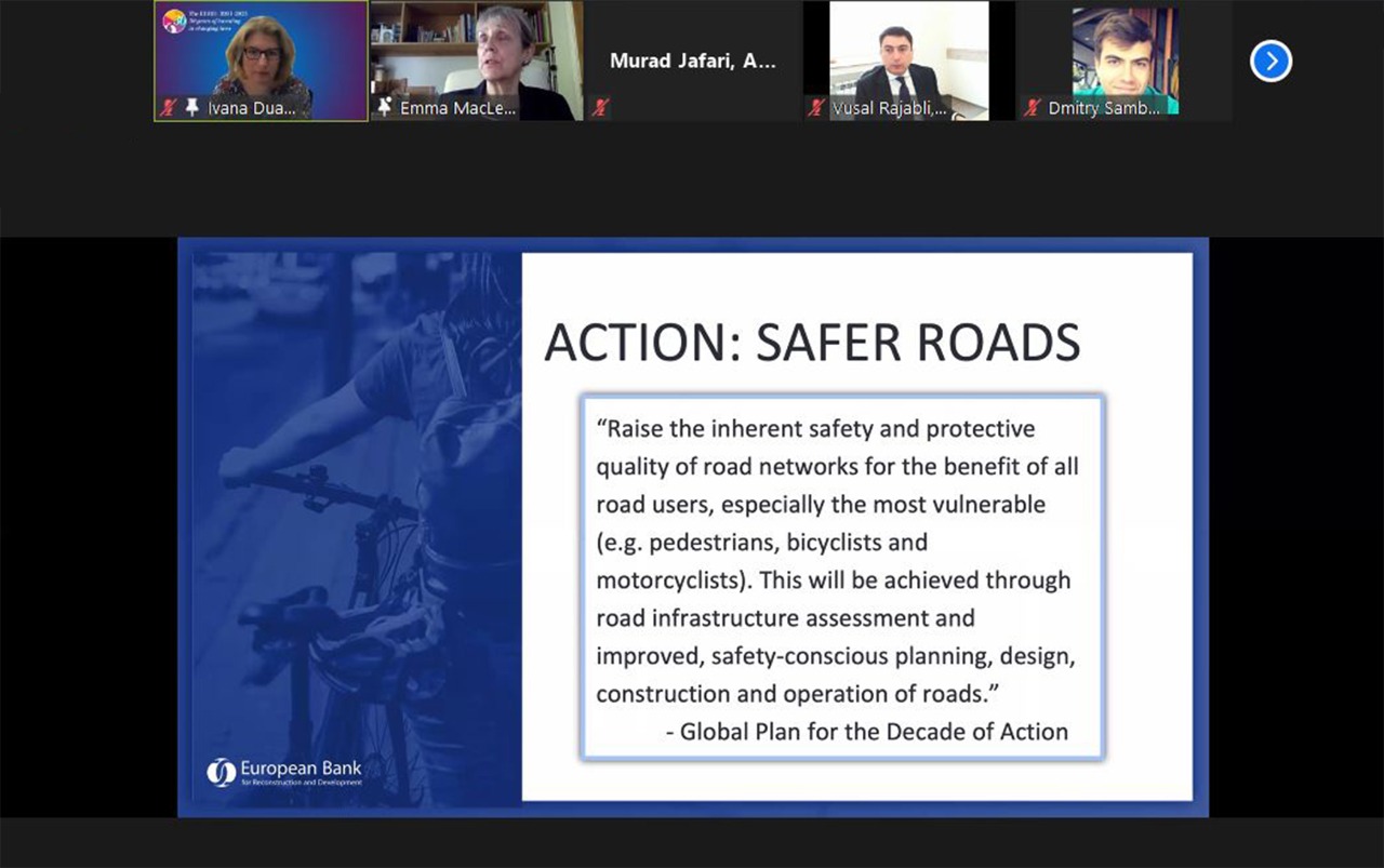 26-27 may 2021-ci il tarixlərində keçirilmiş Avropa Yenidənqurma və İnkişaf Bankının Yol Hərəkəti Təhlükəsizliyi Mühəndisliyi vebinarında AYİB-in expertləri, AMAK və EASST-dən mütəxəssislər bütün yol istifadəçiləri üçün yol hərəkəti təhlükəsizliyinin inkişaf layihələri ilə bağlı əsas mövzuları müzakirə etdilər. Azərbaycan Avtomobil Yolları Dövlət Agentliyi, Baş Dövlət Yol Polisi, Bakı Nəqliyyat Agentliyi, Dövlət Şəhərsalma və Arxitektura Komitəsi, Dünya Səhiyyə Təşkilatının Azərbaycandakı nümayəndəliyi, SOCAR, Nəqliyyat, Rabitə və Yüksək Texnologiyalar Nazirliyi, Lənkəran Şəhər İcra Hakimiyyəti, Sumqayıt Şəhər İcra Hakimiyyəti, Yasamal Bələdiyyəsi, Azərbaycan Texniki Universiteti, ADA Universiteti, Abşeron Ceyranbatan Peşə Məktəbi, Azərbaycan Memarlıq və İnşaat Universiteti, Aviasiya və Avtomobil Nəqliyyatı üzrə Bakı Dövlət Peşə Təhsil Mərkəzinin nümayəndələri vebinarda iştirak etmişdir. Tədbirin 1-ci günü yol hərəkəti təhlükəsizliyi mühəndisliyi, sürətin idarəedilməsi, maraqlı tərəflərin iştirakı, həssas yol istifadəçilərinin məkan və ya zamana nəzərən ayrılması və bir çox digər mövzular müzakirə edildi və iştirakçılar onları maraqlandıran sualları təqdimatçılara ünvanlandırdılar. Tədbirin 2-ci günündə yol hərəkəti təhlükəsizliyi auditi, yol hərəkəti təhlükəsizliyinin iqtisadiyyatı, iqlim risklərinin qiymətləndirilməsi və idarə olunması, qiymətləndirmə reytinqi və digər vacib mövzularla bağlı təqdimatlar edildi. Eyni zamanda, vebinarın sonunda AYİB tərəfindən təmin olunmuş Yol Hərəkəti Təhlükəsizliyi Mühəndisliyi E-təlim kursunun ümumi məqsədi dizaynerlər, lahiyəçilər və mühəndislər üçün Təhlükəsiz Sistem Yanaşmasına əsaslanan düzgün yol hərəkəti təhlükəsizliyi və auditinin fundamental prinsiplərini təqdim etməkdir.